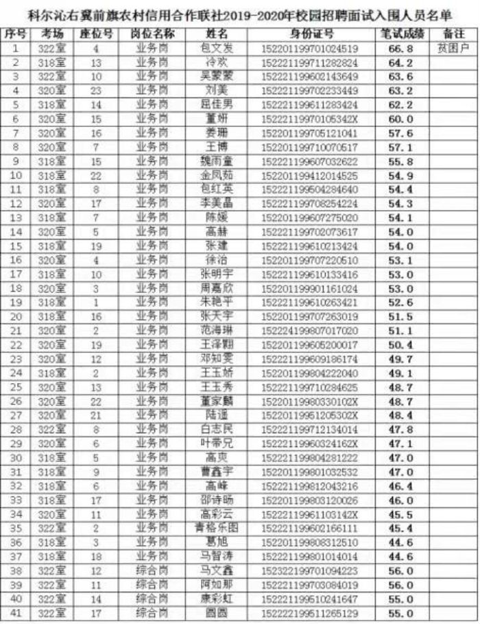 附件:科爾沁右翼前旗農(nóng)村信用合作聯(lián)社2019-2020年校園招聘面試入圍人員名單