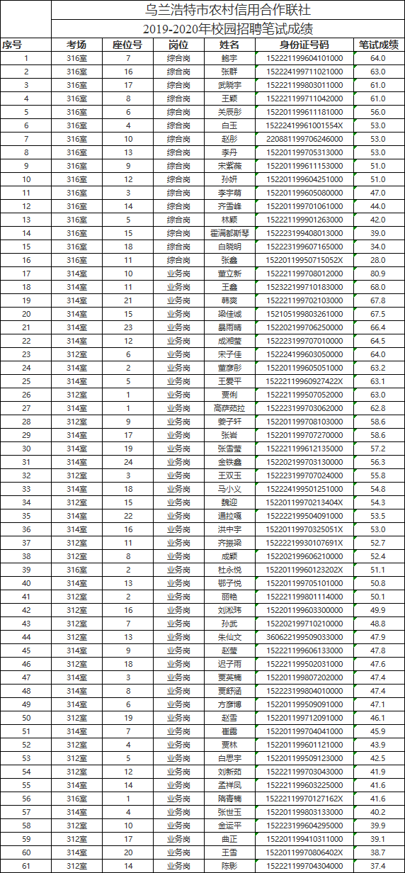 附件:烏蘭浩特市農(nóng)村信用合作聯(lián)社2019-2020年校園招聘筆試成績